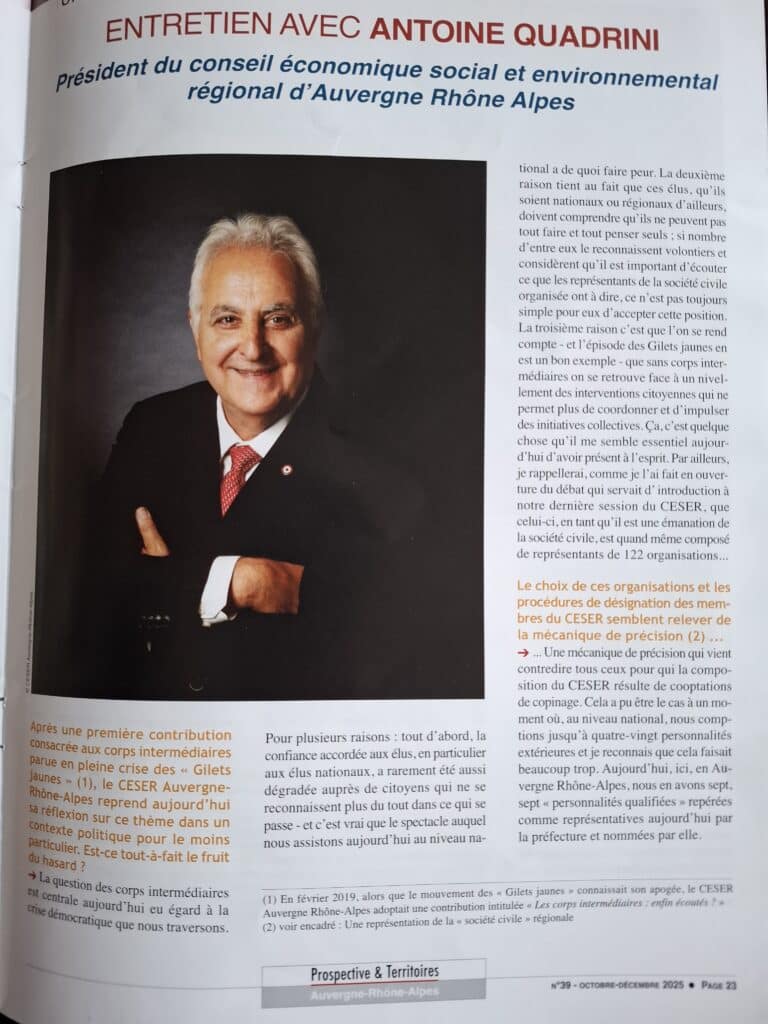 Antoine Quadrini, le Président du CESER Auvergne Rhône-Alpes a donné une longue interview dans l’édition du trimestriel Prospective et Territoires. L’occasion de rappeler les fondements de l’existence des CESER mais aussi leur utilité dans la crise démocratique que nous traversons où selon Antoine Quadrini 3 éléments les rendent indispensables :